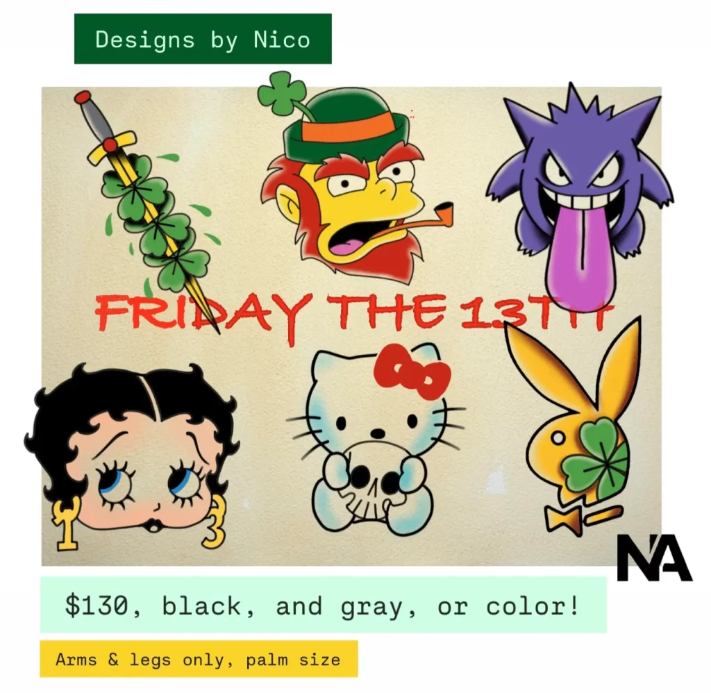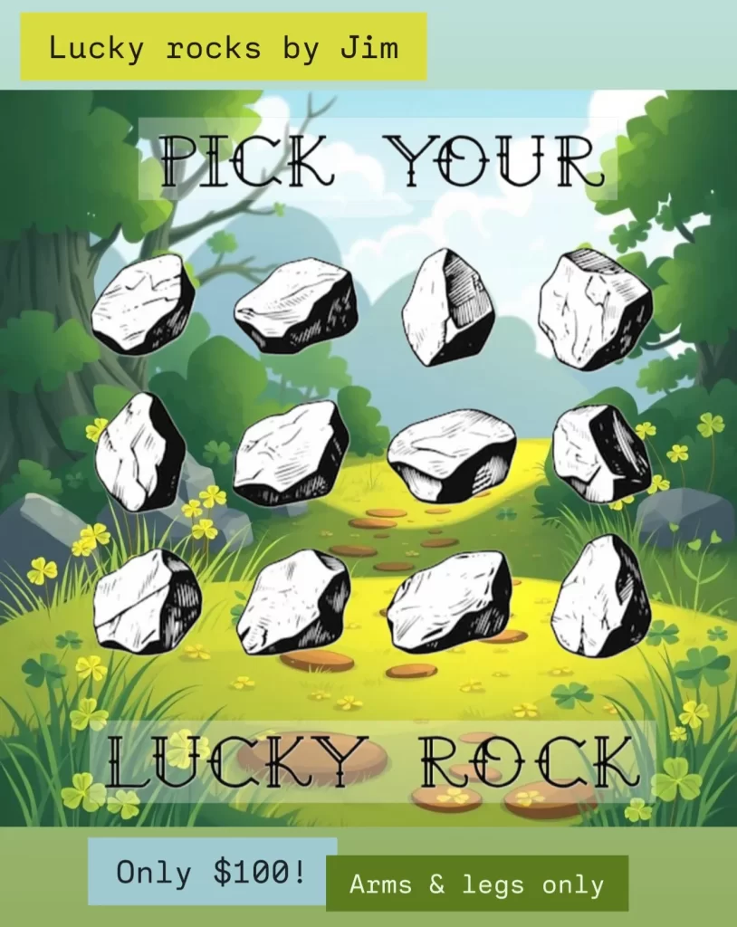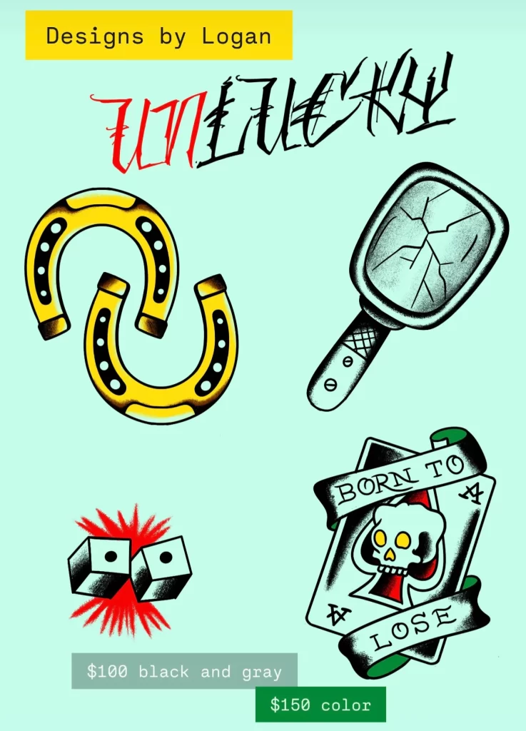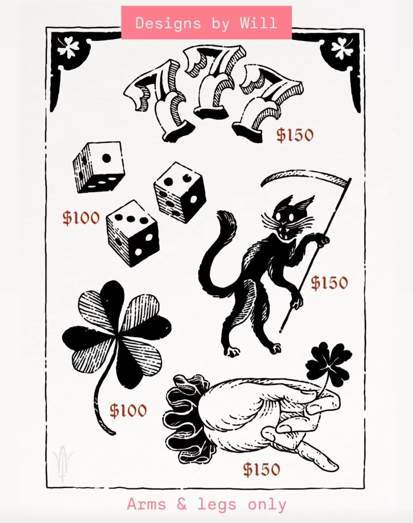 This March, we’re leaning into LUCKY X UNLUCKY! Tattoo artists have created brand-new flash designs exclusively for the event (Mar 13-17): playful and just a little deranged (a tattoo of a rock?! Yes, please!). Scroll down to see what’s available!